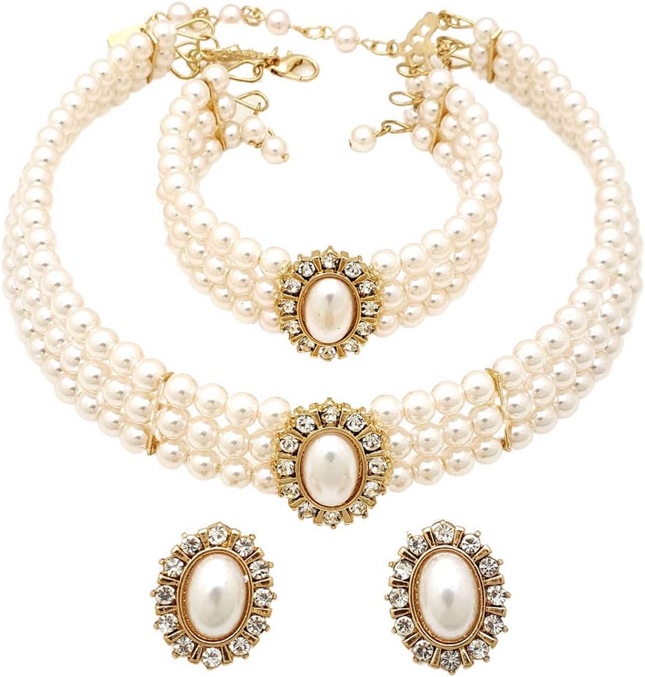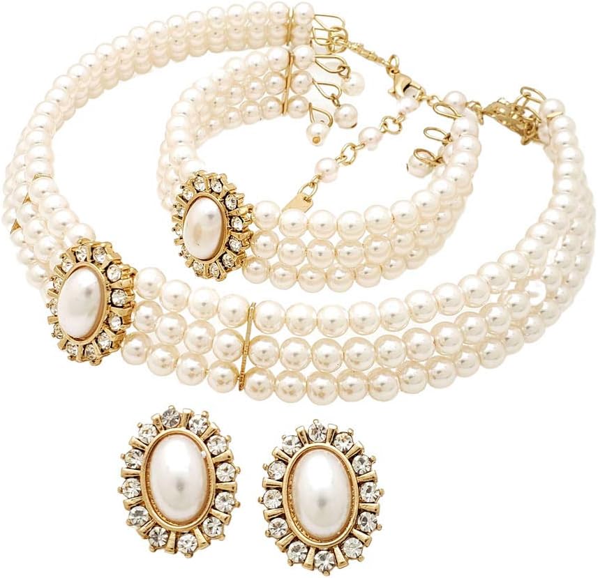 Amazon Discount Super Cheap $17.99 Functional 3 Rows Rhinestone Trimmed Simulated Pearl Choker Necklace, Bracelet, Pierced Earring 3 Set on Amazon