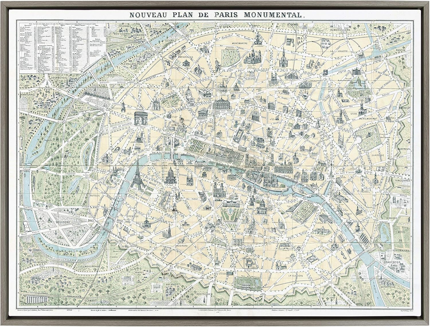 Take a trip into the long-winding roads of Paris with this beautiful map art. Framed in the USA in Waunakee, Wisconsin, this floating canvas art will be a pleasure to look at every day in your living room, bedroom, office, or any room in the home. This art print also makes an excellent gift for birthdays, holidays, or house-warming parties. Printed on gallery-wrapped canvas and framed with a lightweight polystyrene frame, this wall art has two hangers already attached to the MDF back for easy wall display. The outer dimensions are 38 inches by 28 inches by 1.63 inches. Print Name: “Nouveau Plan De Paris Monumental Map”