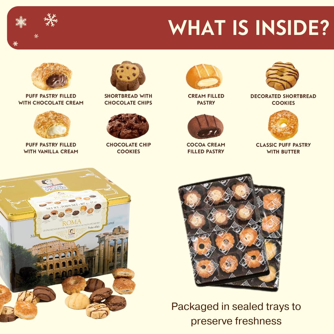 Cookies & Pastries – Indulge in the authentic taste of Italy with the Pasticceria Matilde Vicenzi Roma Gift Tin. Filled with a delightful assortment of puff pastries, cream-filled pastries, and crispy Italian cookies, our cookies tin makes an ideal gift or an indulgent sweet treat.