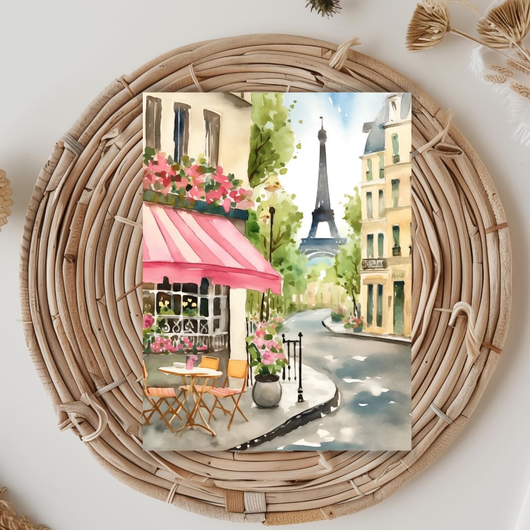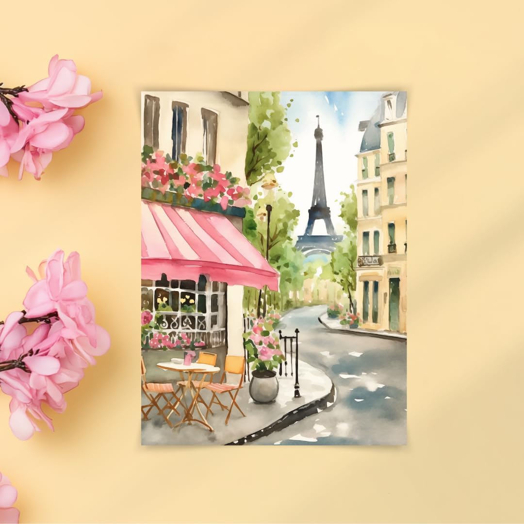 𝗙𝗥𝗔𝗠𝗘𝗦 𝗡𝗢𝗧 𝗜𝗡𝗖𝗟𝗨𝗗𝗘𝗗- 𝗣𝗥𝗜𝗡𝗧𝗦 𝗢𝗡𝗟𝗬 添加触摸用这幅令人惊叹的水彩画为您的家增添巴黎魅力,以埃菲尔铁塔阴影下的古色古香的咖啡馆为特色。粉色遮阳篷、舒适的小酒馆座椅和浪漫的氛围唤起了光之城永恒的优雅。这件艺术品非常适合旅行、法国和浪漫装饰爱好者,将巴黎的精髓带入您的空间。纸张质量:230克/平方米