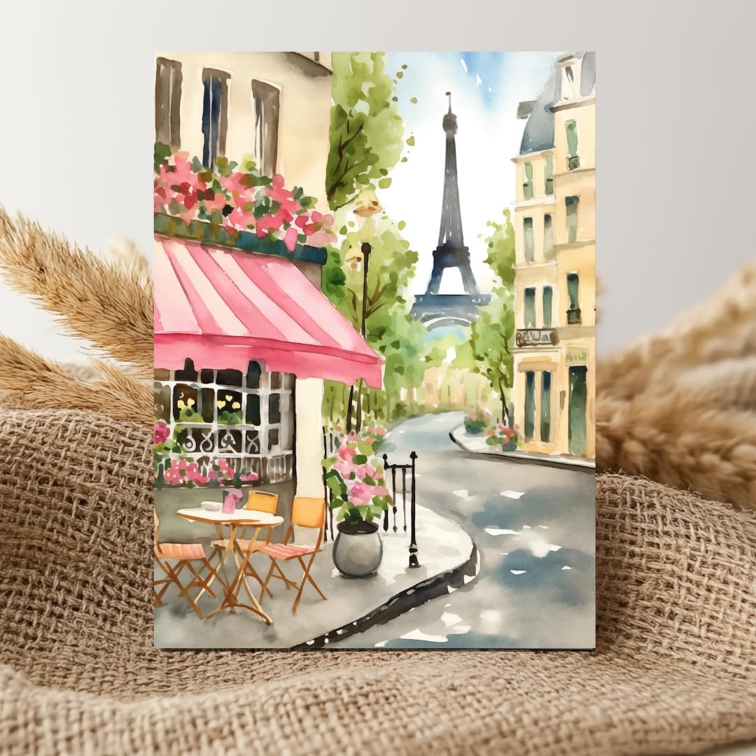 Write an attractive sale article in Chinese about why you should buy 5×7 巴黎咖啡馆水彩画、埃菲尔铁塔街景艺术、法式小酒馆装饰、浪漫巴黎墙壁艺术品、无框