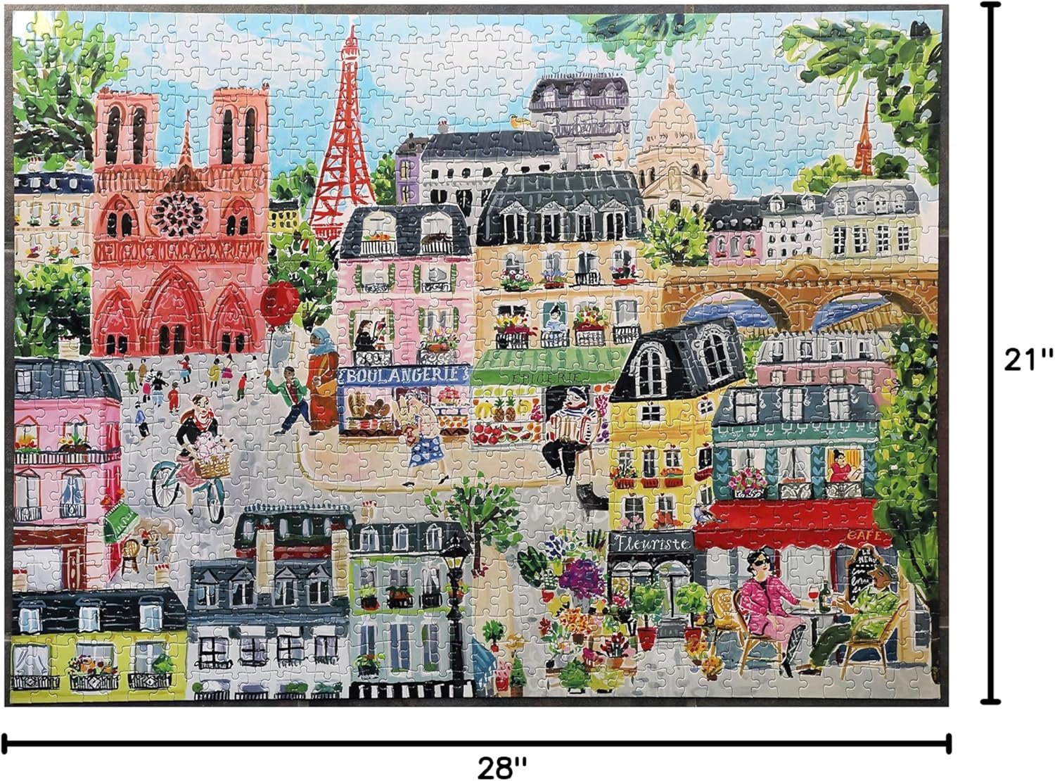 在 eeBoo 的《Piece and Love Paris in a Day》1000 块拼图中解开谜题。巴黎的这个小片区距离埃菲尔铁塔仅有很短的自行车车程。现在你几乎可以听到手风琴的声音并品尝羊角面包。由詹妮弗·奥金·刘易斯绘制。我们的 1000 块矩形拼图经过精心调试和精美设计,提供一种无屏幕、轻松的方式来练习冥想正念或与朋友和家人分享温和的合作活动。