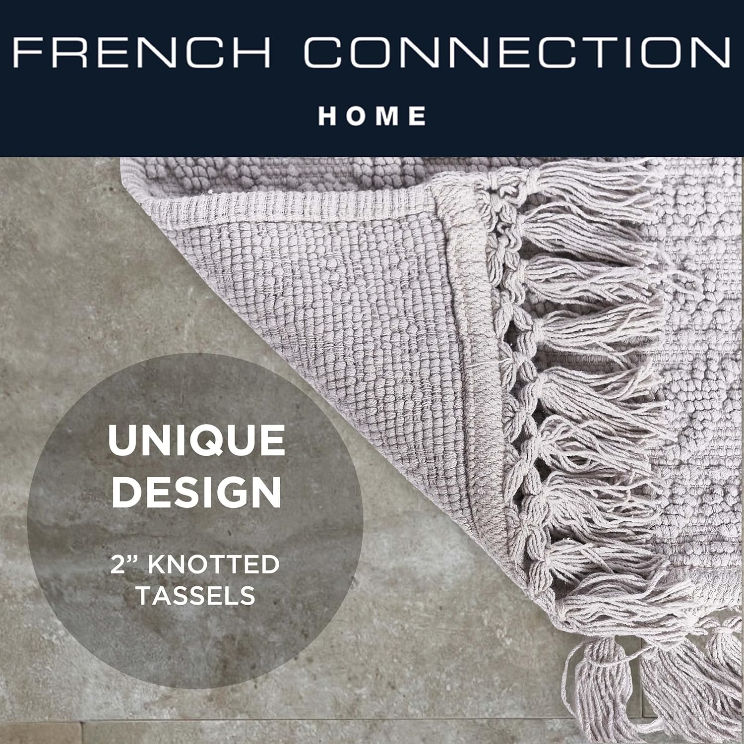 As stylish as they are durable, French Connection Nellore Collection features 100% natural cotton specially woven to resemble a beaded rug. Each bath rug is finished with chic fringe in classic, neutral colors, perfect for any bathroom décor. Thick, absorbent 100% cotton is woven for long-lasting use. Rich color options include navy, grey, light blue, medium grey, light grey, ivory, and white. Available in various sizes. Machine wash cold separately with mild detergent. Do not bleach. For best results, hang dry. Rug grippers or non-skid rug pad recommended and sold separately. 100% Cotton. Imported.