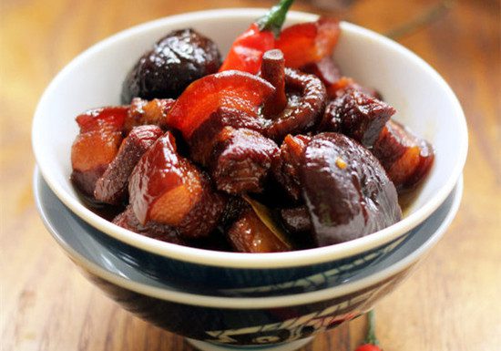 Add pork, stir-fry and brown them. Then, add star anise, bay leaf, licorice and