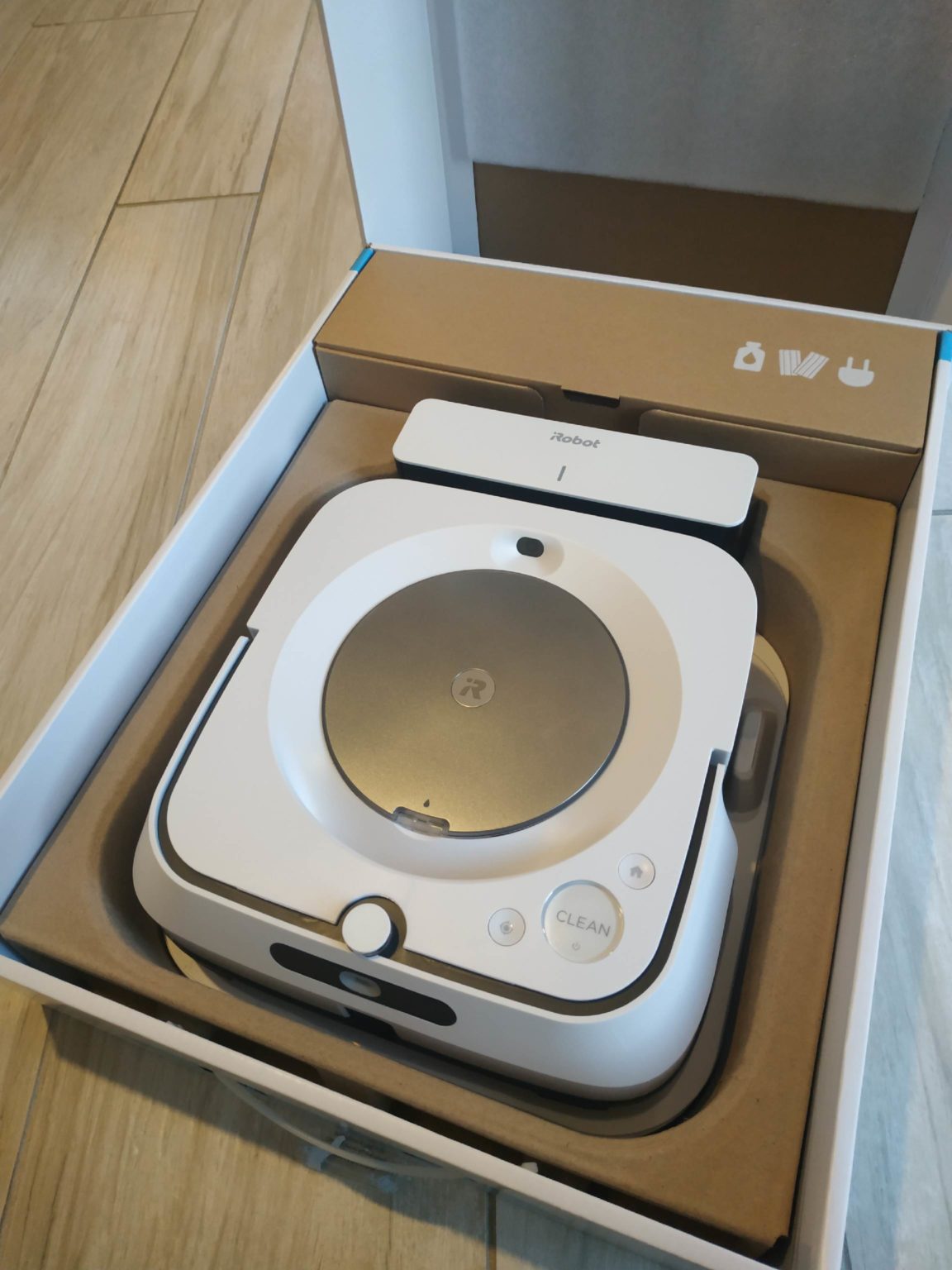 By opening the box, we find the Braava Jet M6 robot, its base, the power supply cable, a 118 ml detergent bottle, a set of two disposable mops, a washable mop, a disposable microfiber (for the sweeping function ) and a last washable microfiber.