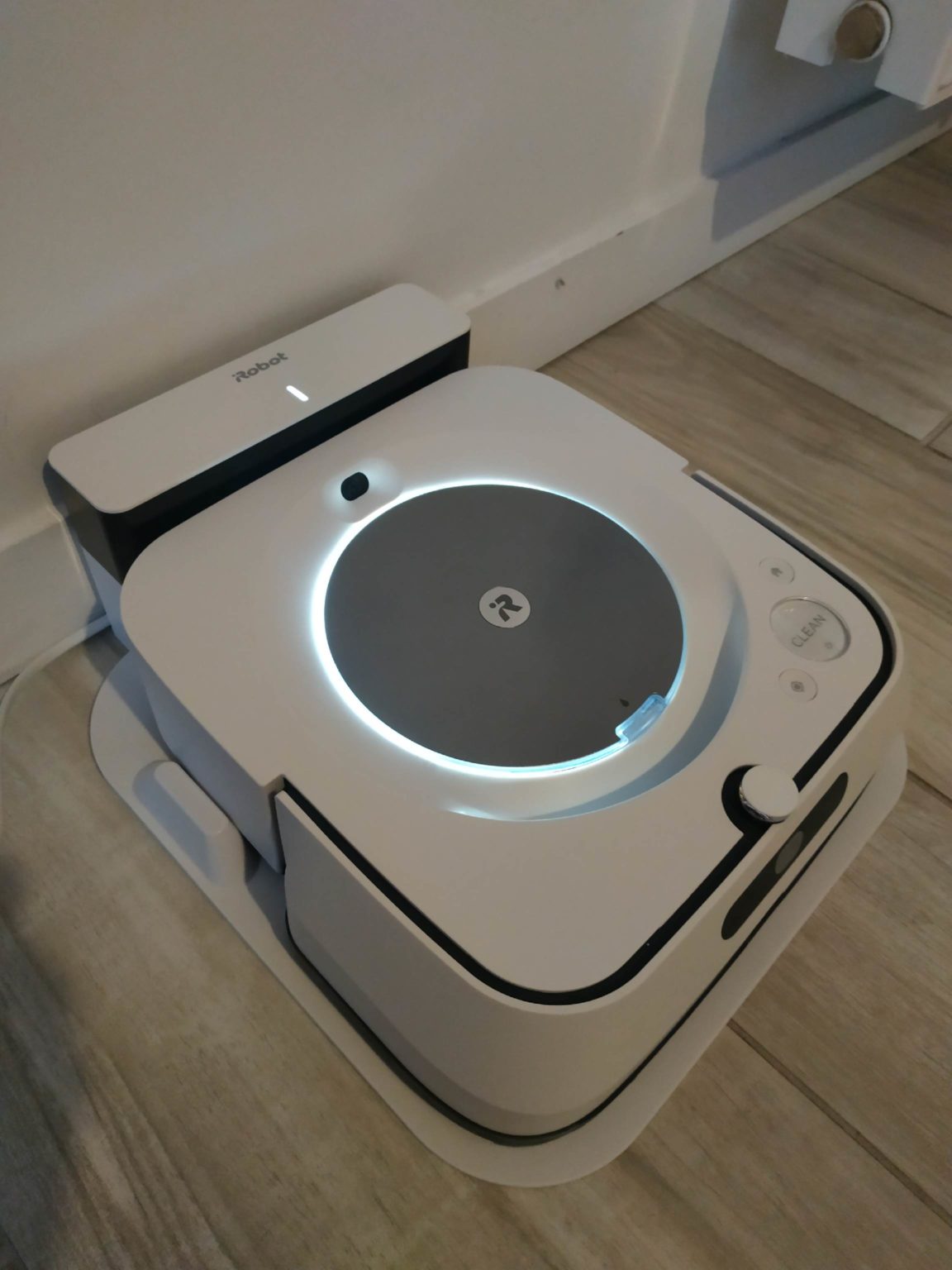 When you look at it, the recently tested s9 + shows some family resemblances with this Braava Jet m6. Both feature this ring that lights up when the robot is on the move. In addition, they embed a camera in the hull to map the space in which they operate. Finally, they both have the same minimalist control panel. We find the essential “Clean” button which starts cleaning with a simple press as well as the button to order a return to the base (house icon) and a third to trigger a targeted cleaning (Spot mode).