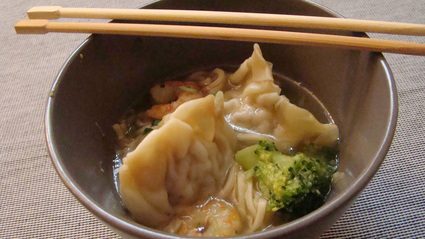 place in a bowl, some noodles, vegetables, dumplings 4, the broth and shrimp!