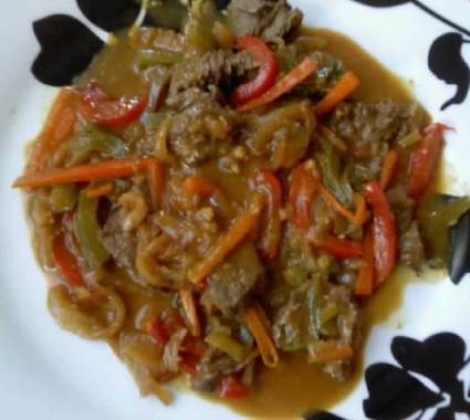 Cut the vegetables into julienne and meat into strips (like a hot stone) and