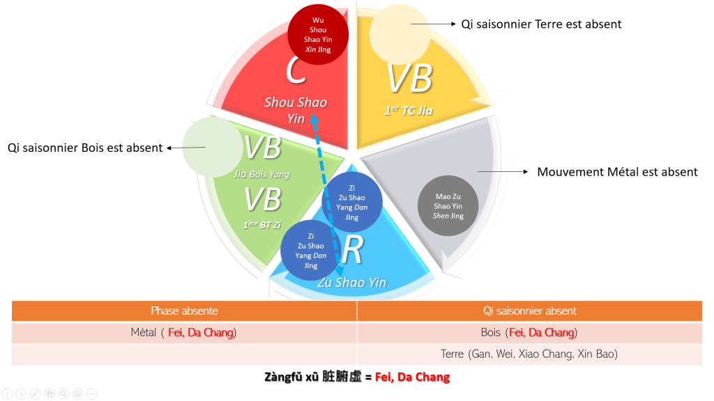 The seasonal Qi of the Zi branch (associated with the Gallbladder) is WATER, that of the Mao branch (associated with the Kidneys) is METAL, that of the Wu branch (associated with the Heart) is FIRE. WOOD and EARTH are absent.