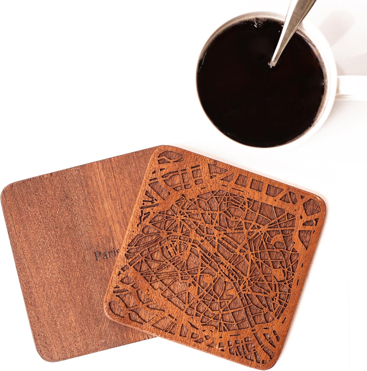 节省 $25.99 创新的 巴黎地图杯垫,由 O3 Design Studio 设计,4 件套,沙比利木制杯垫,带城市地图,手工制作 美国亚马逊Amazon