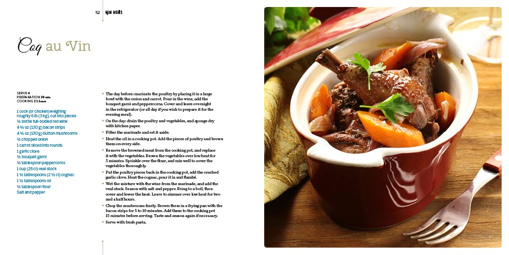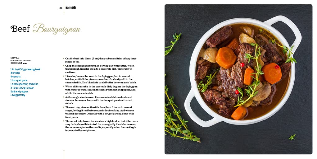Review: Bon Appetit! Best Parisian Bistro Recipes: For Food Lovers. Questa è l’edizione inglese del marzo 2023 pubblicata da Parigramme con il copyright originale del 2018. Ha il Numero di Riferimento Internazionale per i Libri, numero ISBN, 978-2-37395-229-2. à di circa 18 x 18 cm e 14 mm di spessore. L’edizione con copertina morbida che ho selezionato ha una copertina secondaria lucida che è pratica se la usi in cucina, anche se scivola via troppo facilmente. Si tratta di 144 pagine totali, che comprendono le pagine introduttive, l’indice, alcune pagine con solo foto e poi le ricette. Le pagine sono di buona qualità che resistono allo strappo. Ogni ricetta ha un elenco di ingredienti e metodo di cottura sul lato sinistro e un’immagine fotografica d’archivio sulla destra. Quelle foto d’archivio [stock photos] sono la mia prima delusione. Tutti provengono da Shutterstock, che fornisce immagini fantastiche, ma in quest’era di facile fotografia digitale, sarebbe meglio vedere le immagini originali scattate durante il test delle ricette. L’introduzione di una pagina inizia con la frase “Those frogs!” [quelle rane]. “Frogs” in questo contesto è un termine dispregiativo per i francesi. Perché iniziare un libro sulla cucina francese con un termine offensivo per i francesi? Almeno un diminutivo ‘Those Frenchies!’ [Quei francesi] è forse meno dispregiativo. Altri esempi di vocabolario scadente includono scrivere â1½ hourâ [pagine 66, 78, 138] quando dovrebbe essere ‘hours’, scrivere due volte ânob of butterâ quando dovrebbe essere âknob of butterâ [pagine 62, 110] , e scrivendo âscatter with flaked almondsâ quando dovrebbe essere âsprinkle withâ [pagg. 20, 102]. Le ricette sono suddivise in tre sezioni: 16 ‘Starters’ [Antipasti], 28 ‘Main Dishes’ [Piatti Principali], 21 ‘Desserts’ [Dolci] â 65 in totale. Ogni pagina della ricetta ha il nome del piatto in vari stili caratteri – parte in caratteri color bronzo – parte in nero. Se il nome è in francese, non c’è traduzione. Se il nome della ricetta è in inglese, o per lo più in inglese, sotto c’è il suo nome francese in un carattere più piccolo. Tutte le ricette dicono “Serve 4” – il che è strano. 1. perché le ricette inglesi tipicamente usano la terza persona singolare âServesâ â ‘it serves four’ â non ‘it serve four’; e 2. perché tutte le ricette servono comunque a quattro; sarebbe stato meglio scrivere una volta nell’introduzione che ogni ricetta è pensata per servire quattro persone e non ripeterla 65 volte. Ogni ricetta ha tempi di preparazione e cottura; insieme agli ingredienti a sinistra; tutto a sinistra. Nessuna delle istruzioni riempie una pagina e il carattere è estremamente piccolo. Le lettere minuscole sono alte circa 1,5 mm, ovvero da 4 a 5 in pica o ‘punti’! I giornali standard usano da otto a dieci pica. Anche se non hai bisogno di occhiali da lettura, devi prendere il libro mentre cucini per vederlo. Le unità di misura per gli ingredienti sono principalmente in misure imperiali – tazze, cucchiai, once – con conversioni metriche tra parentesi. Personalmente avrei scelto solo l’uno o l’altro, poiché la maggior parte delle persone può convertirsi da sola. Le istruzioni sono prolisse. Per esempio; “Flour the slices of calfâs liver and season with salt and pepper,â potrebbe essere semplicemente ‘Flour the liver and season.’ Oppure, “Cook the endives in boiling water for 10 minutes,” potrebbe essere semplicemente ‘Boil the endives for 10 minutes.’ Molte volte la grammatica inglese è molto scarsa. Ad esempio, “Place a slice of foie gras on each tournedos … .” Dovrebbe essere singolare, ‘tournedo’ – non plurale “tournedos”. A volte la quantità della lista degli ingredienti non coincide con il metodo di cottura. Ad esempio, la ricetta della Hanger Steak [bistecca di manzo] richiede quattro bistecche, cotte in due cucchiai di burro – ciascuna, che è almeno otto cucchiai di burro in totale – ma la lista degli ingredienti richiede due cucchiai (più altro burro freddo, usato in un’altra fase ). L’ortografia usa principalmente inglese americano – “color” invece di ‘colour’; âliterâ invece di ‘litre’. Nel complesso la grammatica è scomoda, come una traduzione di Google. Ognuna delle tre sezioni principali â Starters, Main Dishes, Desserts â ha i propri piatti elencati in ordine alfabetico. Gli ingredienti per ogni ricetta sono più o meno elencati nell’ordine in cui compaiono nelle istruzioni di cottura; il che è positivo. Ci sono momenti in cui un ingrediente utilizzato nella descrizione non è elencato nell’elenco degli ingredienti. Ad esempio per la Veal Blanquette [blanquette di vitello], la sua descrizione dice âCook the veal with a little unsalted butter … .” [Cuocere il vitello con un po’ di burro non salato… .], ma tra gli ingredienti non c’è il burro. Oppure un ingrediente è elencato due volte, come sale e pepe per la Torta del Pastore Francese. Escludendo i tempi prolungati necessari per la refrigerazione notturna o simili, il tempo medio di preparazione è di 19 minuti, il tempo medio di cottura è di 44 minuti e il tempo medio combinato di preparazione+cottura è di 55 minuti. Il tempo più breve di 10 minuti è per circa otto piatti. Il tempo più lungo è di sei ore per Beef Bourguignon. Se si escludono i piatti Beef Bourguignon e Choucroute, il tempo medio combinato è di 48 minuti. Il piatto medio ha otto ingredienti unici, con sale o/e pepe che sono uno di quelli la maggior parte delle volte. Credo che tutti o quasi tutti gli ingredienti siano abbastanza generici da poter essere trovati facilmente in molte regioni europee, nordamericane e in molte altre regioni geografiche. Se un ingrediente è un po’ specifico, a volte vengono suggerite delle alternative. Pochissimi ingredienti sono elencati con nomi di marca e, se lo sono, di solit